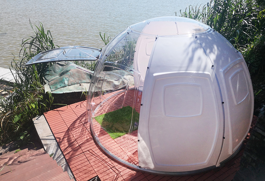 4.半球型結構:半球型的結構設計使其結構更加穩定堅固,抗沖擊性能高更高,防護性能更好,無兜風面,可抗12級風。相比于市面上的普通PVC泡泡屋的有氣味,無阻燃且需要連續充氣產生噪音,本產品可快速拼接,室內無氣味,可阻燃,噪音小,在野外使用時是一個值得信賴的安全庇護所;