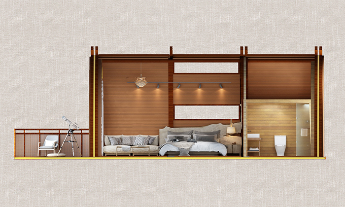 這款產品是天幕小屋家庭款,產品戶型是標準間,外部面積:72 ㎡,內部面積:38 ㎡,外部尺寸:8*9 m ,內部尺寸: 4.5*8.5m,主體高度:3.7 m ,墻面高度:2.2 m,防風等級:8 級。