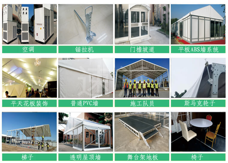 我司嚴(yán)格執(zhí)行ISO9001的質(zhì)量管理體系,確保不良產(chǎn)品的最小化及客戶滿意度的最大化。我們的的主要產(chǎn)品包括可移動(dòng)的模塊化鋁合金支架篷房,有不同風(fēng)格的篷房及裝飾可供選擇,篷房跨度從3米到60米。此外,還包括錐頂篷房和吊頂篷房,以及篷房配件,如照明燈具、地板、空調(diào)、桌椅及其它用于篷房內(nèi)部的家具。篷房可廣泛應(yīng)用于大小型活動(dòng)、婚慶、展會(huì)、體育、酒店、航空和工業(yè)等其它領(lǐng)域。篷房框架結(jié)構(gòu)為高強(qiáng)度鋁合金6061/T6型材,篷布為防水、阻燃的雙面PVC涂層聚酯纖維布,主體結(jié)構(gòu)風(fēng)載荷不少于100Km/h。
