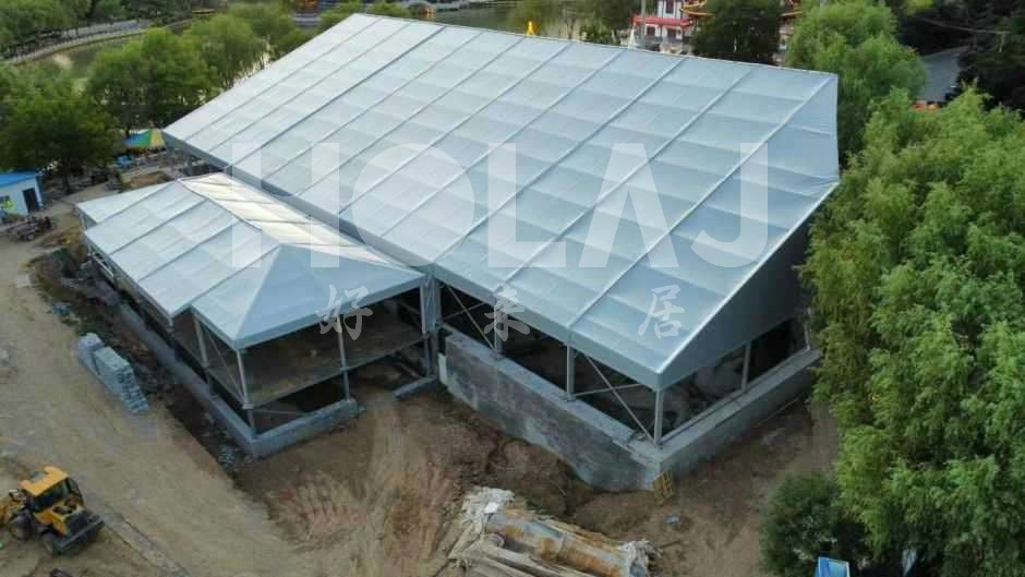 好來居篷房采用坡屋面鋁合金篷房結(jié)構(gòu)形式搭建了40*55*3.3異形主體篷房和10*25*3.3入口門廊,對考古現(xiàn)場進行覆蓋保護。建筑形式為裝配式人字頂篷房,由若干鋁合金管材和鋼結(jié)構(gòu)節(jié)點板拼接成骨架,外面罩以膜材形成。